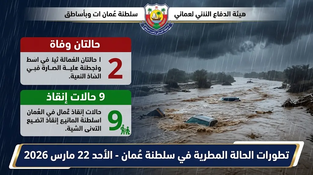 شهدت سلطنة عُمان، منذ الساعات الأولى من صباح اليوم الأحد 22 مارس 2026، استمراراً لتداعيات الحالة الجوية الماطرة التي بدأت أمس السبت، وأسفرت عن تسجيل خسائر بشرية وعمليات إنقاذ واسعة في عدة محافظات نتيجة جريان الأودية والسيول الجارفة.