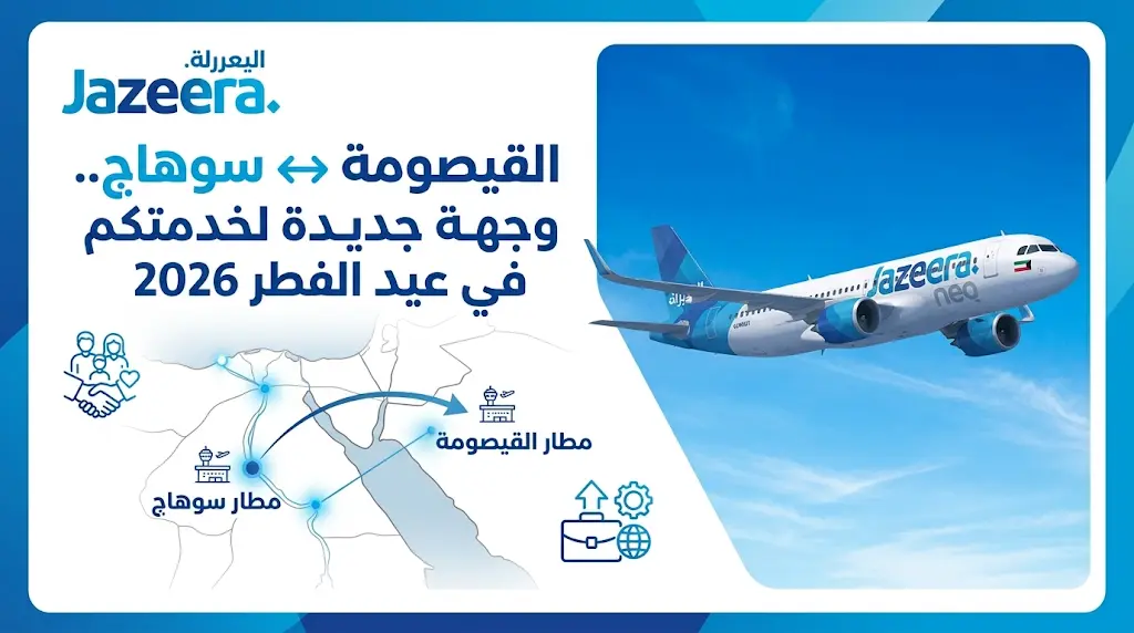 سوهاج الوجهة السادسة لطيران الجزيرة في مصر برحلات مباشرة من مطار القيصومة لخدمة المسافرين في عيد الفطر 2026