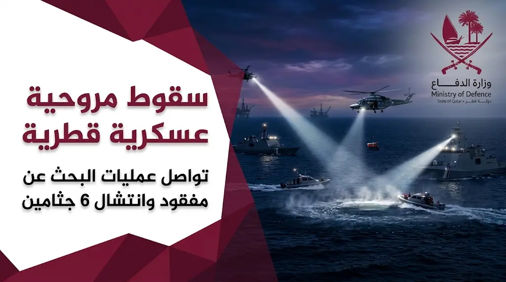 أعلنت وزارة الدفاع القطرية، عبر حسابها الرسمي، عن تفاصيل مؤلمة تتعلق بحادث سقوط طائرة مروحية مخصصة لنقل الأفراد، والتي سقطت فجر اليوم الأحد 22 مارس 2026، أثناء تنفيذ مهمة تحليق فوق المياه الإقليمية لدولة قطر، وباشرت الفرق المختصة فور وقوع الحادث عمليات البحث والإنقاذ والتحقيق في الأسباب التقنية التي أدت إلى سقوط الطائرة.