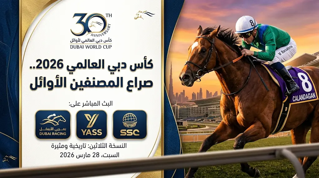 تتجه أنظار عشاق الفروسية في المملكة العربية السعودية والعالم نحو مضمار “ميدان” بدبي، حيث تشهد النسخة الثلاثون من كأس دبي العالمي 2026 حضوراً تاريخياً لنخبة الجياد، يتقدمها الحصان “كالانداجان” المصنف الأول عالمياً، والذي تلقى الضوء الأخضر رسمياً للمنافسة على لقب “شيماء كلاسيك”.