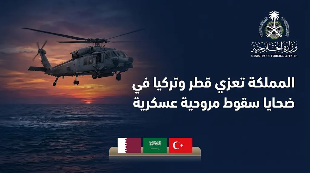 أصدرت وزارة الخارجية السعودية بياناً عاجلاً اليوم الأحد 22 مارس 2026، نقلت فيه تعازي ومواساة المملكة العربية السعودية الصادقة لأسر شهداء الواجب، ولحكومتي وشعبي دولة قطر الشقيقة والجمهورية التركية الصديقة، وذلك في أعقاب حادث سقوط طائرة مروحية عسكرية أليم وقع في المياه الإقليمية القطرية.