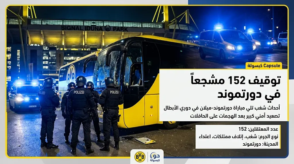 وفقاً للمصادر الميدانية والتحقيقات الأولية التي جرت اليوم الاثنين 23 مارس 2026، بدأت شرارة الأحداث حينما أقدمت مجموعات من جماهير دورتموند على مهاجمة الحافلات التي كانت تقل مشجعي الفريق الضيف في الشوارع المحيطة بالملعب، وأسفر التدخل الأمني السريع عن فض الاشتباكات وفرار المتجمهرين، فيما أكدت التقارير الرسمية عدم تسجيل أي إصابات بشرية نتيجة هذه الأحداث، واقتصرت الأضرار على بعض التلفيات المادية في المركبات.