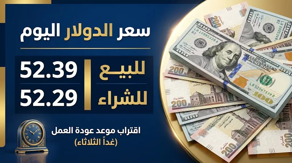 | سعر الدولار (البنك المركزي) | 52.29 جنيه للشراء | 52.39 جنيه للبيع |