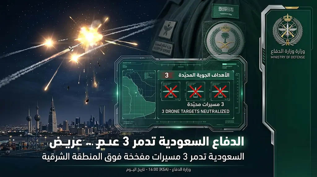 أصدرت وزارة الدفاع السعودية بياناً عاجلاً أكدت فيه نجاح القوات الجوية الملكية السعودية في التصدي لتهديد جوي وشيك استهدف المنطقة الشرقية، وأوضح المتحدث الرسمي باسم الوزارة، اللواء الركن تركي المالكي، أن المنظومات الدفاعية تمكنت من رصد وتدمير 3 طائرات مسيّرة “مفخخة” حاولت اختراق أجواء المملكة مساء أمس الاثنين 23 مارس 2026 (الموافق 5 رمضان 1447هـ).