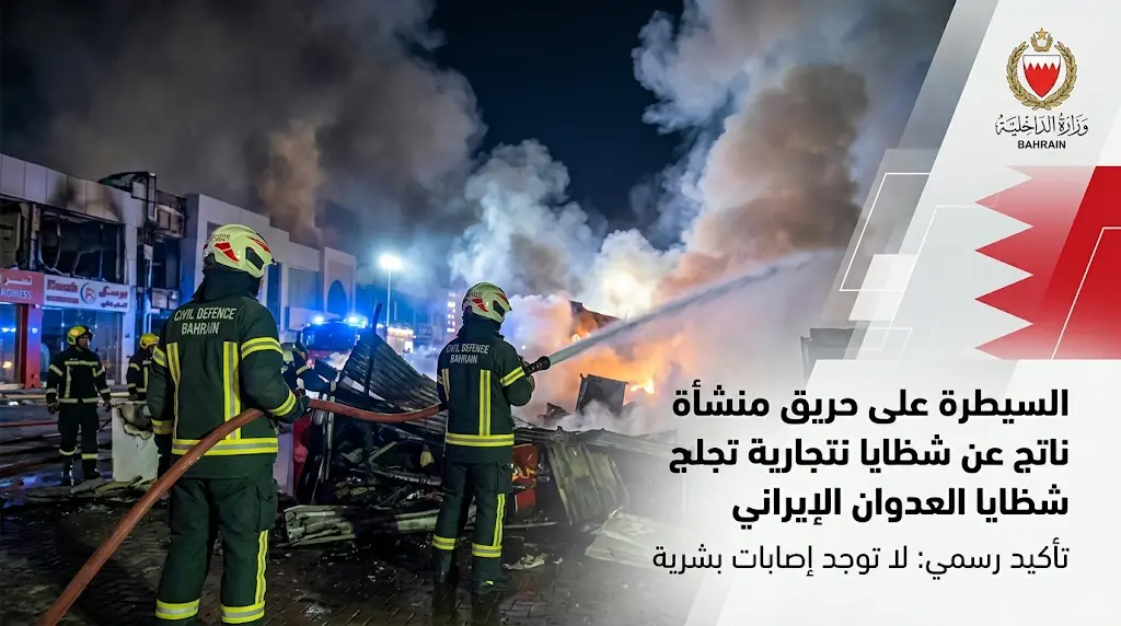 نجحت فرق الدفاع المدني في مملكة البحرين، اليوم الثلاثاء 24 مارس 2026، في إخماد حريق ضخم اندلع في منشأة تجارية تابعة لإحدى الشركات الكبرى، وذلك إثر تعرض الموقع لشظايا ناتجة عن العدوان الإيراني الذي استهدف المنطقة صباح اليوم، وأكدت السلطات أن الفرق المختصة تعاملت مع الحادثة بأقصى درجات الاستجابة السريعة لمنع تمدد النيران إلى المناطق المجاورة.
