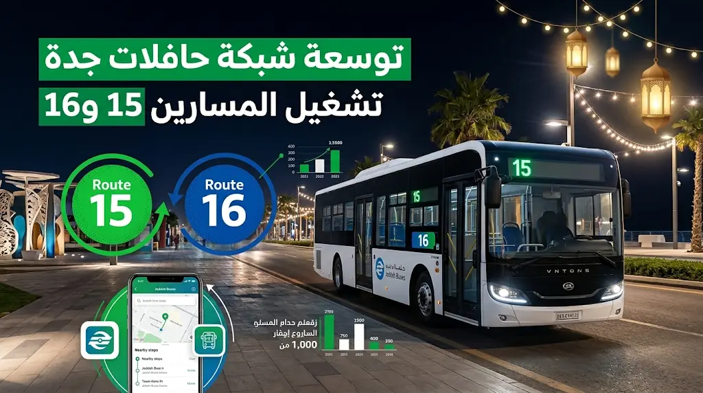 أعلنت شركة مواصلات جدة اليوم الثلاثاء 24 مارس 2026 (الموافق 5 رمضان 1447هـ)، عن البدء الرسمي لتشغيل المسارين الجديدين (15 و16) ضمن شبكة النقل العام بالحافلات، وتأتي هذه الخطوة لتعزيز الربط بين المحاور الحيوية في المدينة، وتسهيل حركة التنقل للسكان والزوار خلال الشهر الفضيل، بما يتماشى مع مستهدفات جودة الحياة ورؤية المملكة 2030.