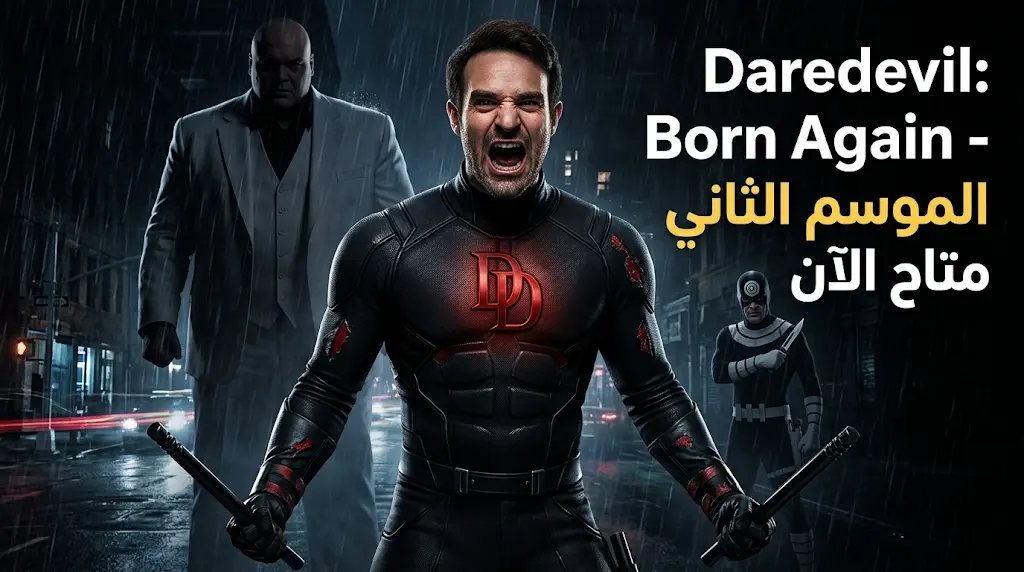 يبدأ اليوم الثلاثاء 24 مارس 2026 (الموافق 5 شوال 1447 هـ) عرض الموسم الثاني من المسلسل المرتقب Daredevil: Born Again عبر منصة “ديزني بلس”، حيث يشهد العمل تحولاً لافتاً في شخصية البطل “مات موردوك”، ويظهر ديرديفل في هذا الموسم بإطلالة سوداء بالكامل مزينة بشعار “DD”، وهو تغيير يتجاوز الجانب الجمالي ليرتبط مباشرة بتصاعد حدة الصراع مع خصمه اللدود “ويلسون فيسك” (كينجبين).