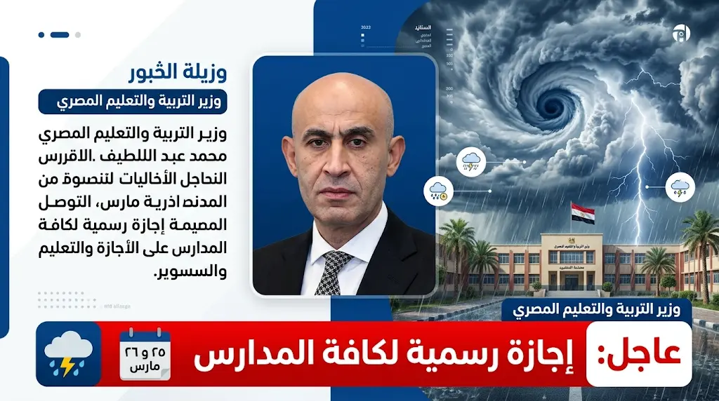 أصدر وزير التربية والتعليم والتعليم الفني المصري، محمد عبد اللطيف، قراراً عاجلاً بمنح كافة المدارس على مستوى الجمهورية إجازة رسمية غداً الأربعاء وبعد غد الخميس، وذلك نظراً لتقارير الأرصاد الجوية التي تشير إلى حالة من عدم الاستقرار الجوي العنيف، وأكدت الوزارة أن هذا الإجراء يأتي كخطوة احترازية لضمان سلامة الطلاب والكادر التعليمي، ولتحقيق تكافؤ الفرص التعليمية في ظل الظروف المناخية الصعبة المتوقعة.