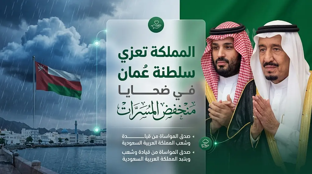 أعربت القيادة الرشيدة في المملكة العربية السعودية، اليوم الثلاثاء 24 مارس 2026، عن خالص تعازيها وصادق مواساتها لسلطنة عُمان الشقيقة، قيادةً وشعباً، في ضحايا الحالة الجوية القوية التي تأثرت بها السلطنة مؤخراً، والتي عُرفت باسم “منخفض المسرّات”.