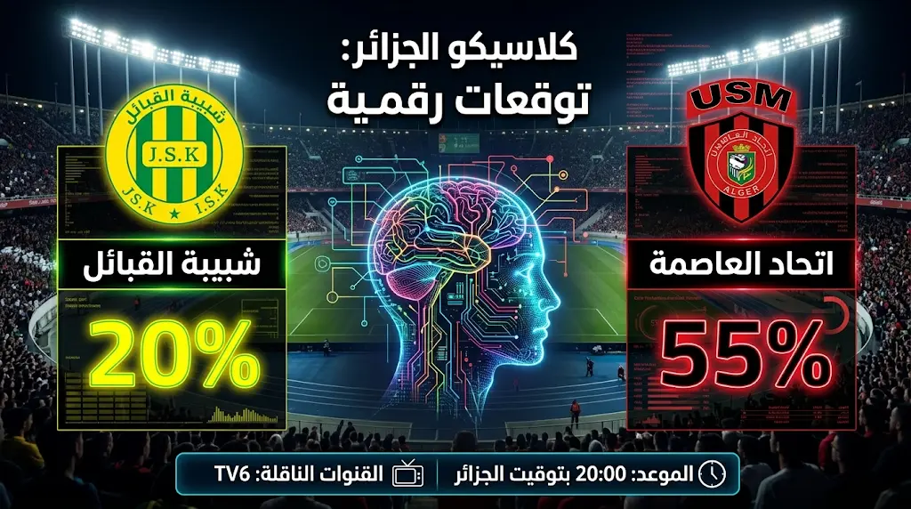 تتجه أنظار عشاق الكرة العربية والجزائرية اليوم الثلاثاء 24 مارس 2026، صوب ملعب 5 جويلية الأولمبي، حيث تُقام مواجهة “الكلاسيكو” المرتقبة بين اتحاد العاصمة وشبيبة القبائل ضمن منافسات الرابطة المحترفة الأولى، ومع تصاعد وتيرة التكنولوجيا، دخل الذكاء الاصطناعي على خط التوقعات ليضع سيناريوهات رقمية دقيقة لهذه القمة الكروية بناءً على معطيات الموسم الحالي 2026.