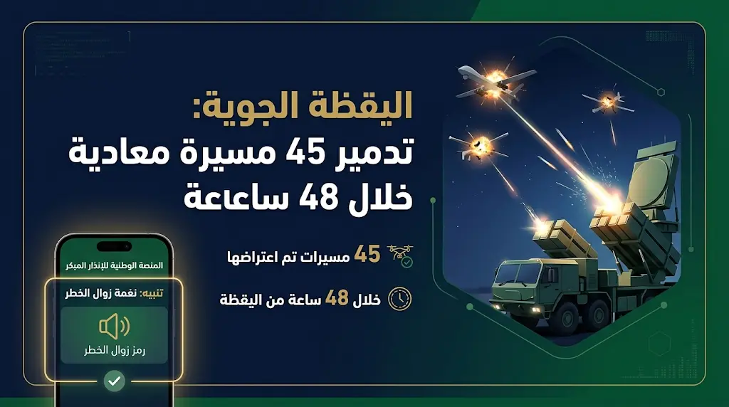 | إجمالي العمليات (48 ساعة) | تدمير 45 طائرة مسيرة بنجاح |