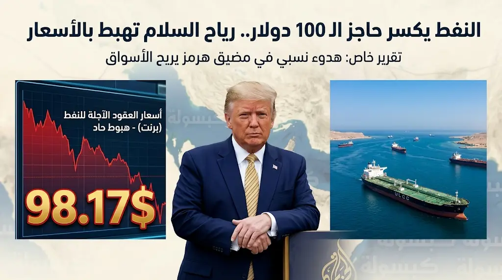 فقد خام برنت القياسي نحو 6.32 دولار من قيمته في ساعات الصباح الأولى من اليوم الأربعاء، ليستقر عند 98.17 دولاراً للبرميل، بعد أن كان قد أغلق في تداولات أمس الثلاثاء عند مستوى 104.49 دولار، هذا الهبوط السريع يعكس استجابة الأسواق الفورية لزوال “علاوة المخاطر الجيوسياسية” التي كانت ترفع الأسعار بشكل مصطنع نتيجة إغلاق الممرات الملاحية.