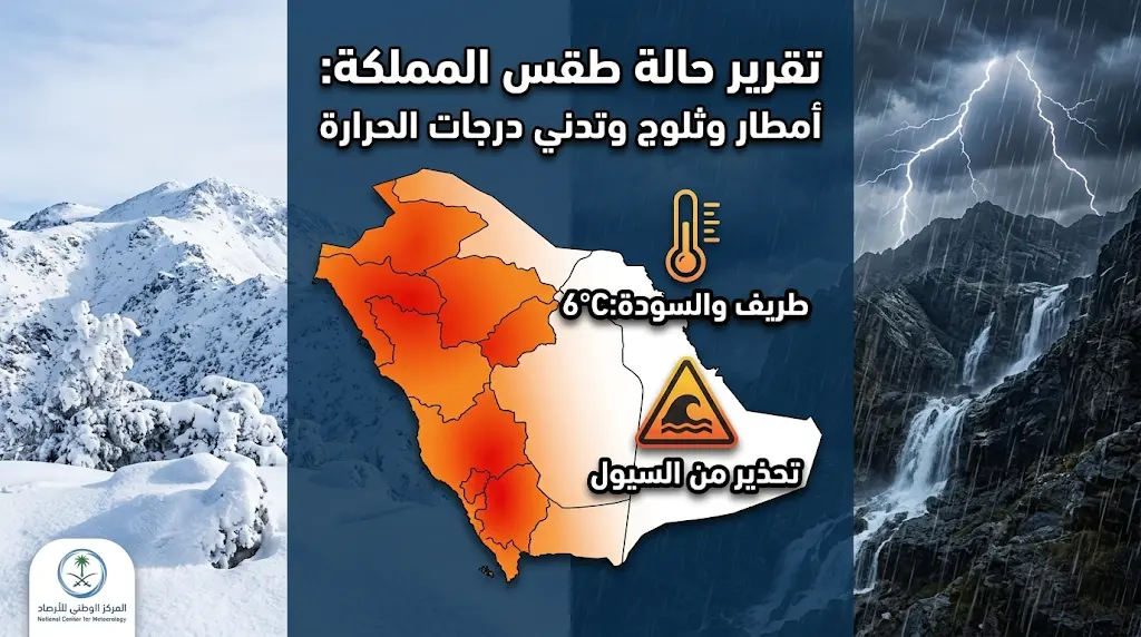 أصدر المركز الوطني للأرصاد تقريراً عاجلاً حول حالة الطقس المتوقعة اليوم الأربعاء 25 مارس 2026 الموافق 6 شوال 1447هـ، محذراً من استمرار التقلبات الجوية الحادة التي تشمل هطولات مطرية كثيفة وجريان للسيول، بالإضافة إلى ظواهر شتوية نادرة في مثل هذا الوقت من العام تشمل تساقط الثلوج على المرتفعات الشمالية.