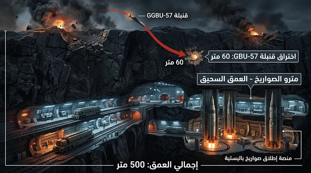 • محدودية الاختراق: قنبلة (GBU-57) الأمريكية، وهي الأقوى في العالم، تخترق 60 متراً من الخرسانة كحد أقصى، بينما تقع القواعد الإيرانية تحت 500 متر من الصخور الصلبة.
