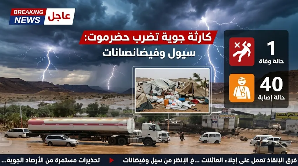 سجلت السلطات المحلية في محافظة حضرموت، اليوم الأربعاء 25 مارس 2026، حصيلة مفجعة جراء موجة الطقس السيئ التي تضرب المنطقة، حيث لقي جندي مصرعه وأصيب نحو 40 آخرين من منتسبي قوات الطوارئ، إثر عواصف رعدية عنيفة وأمطار غزيرة اجتاحت وادي وصحراء حضرموت.