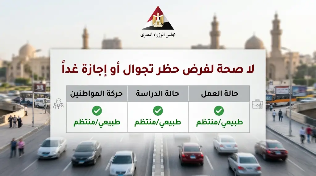- حركة المواطنين: أكدت الحكومة عدم صدور أي قرار بفرض حظر تجوال، مشيرة إلى أن الحركة المرورية وحياة المواطنين تسير بصورة طبيعية في كافة المحافظات.