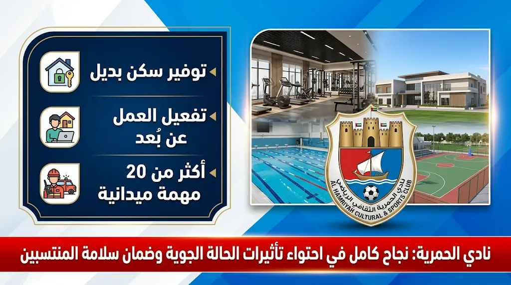 أعلنت لجنة الطوارئ والسلامة العامة بنادي الحمرية الثقافي الرياضي، اليوم الجمعة 27 مارس 2026، عن نجاح خطتها الاستباقية الشاملة في الحد من تأثيرات المنخفض الجوي الذي شهدته المنطقة مؤخراً، وجاءت هذه التحركات بتوجيهات مباشرة من سعادة حميد حسن الشامسي، رئيس مجلس إدارة النادي، لضمان حماية المنتسبين والحفاظ على سلامة كافة المرافق والمنشآت التابعة للنادي.
