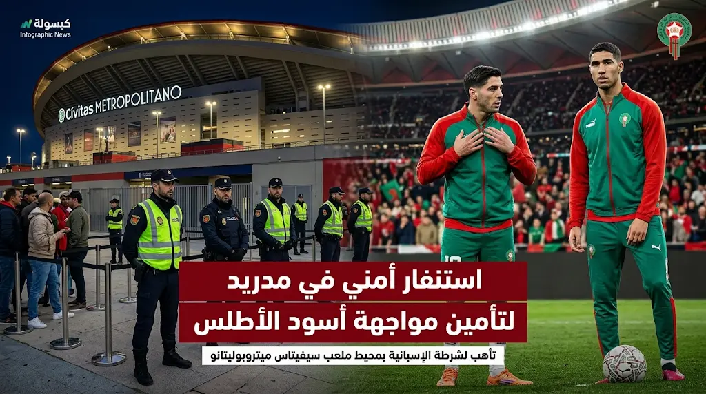 تشهد العاصمة الإسبانية مدريد، اليوم الجمعة 27 مارس 2026، حالة من الاستنفار الأمني القصوى لتأمين المواجهة المرتقبة بين المنتخب المغربي ونظيره الإكوادوري، تأتي هذه المباراة الودية كجزء من التحضيرات النهائية لـ “أسود الأطلس” قبل انطلاق منافسات كأس العالم 2026 الصيف المقبل، حيث يسعى المنتخب المغربي لتأكيد جاهزيته الفنية والبدنية في هذا الاختبار القوي على أرض ملعب “سيفيتاس ميتروبوليتانو”.