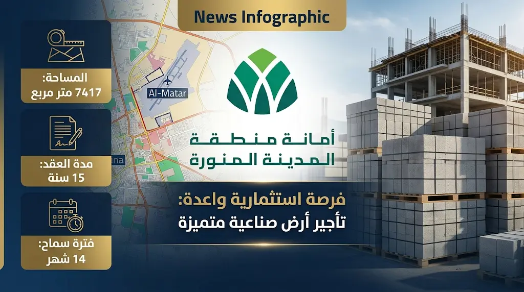 أعلنت أمانة منطقة المدينة المنورة اليوم السبت، 9 شوال 1447 هـ (الموافق 28 مارس 2026)، عن طرح فرصة استثمارية واعدة في قطاع الصناعات الإنشائية، تشمل إنشاء وتشغيل وصيانة مصنع “بلك” متكامل في موقع استراتيجي بحي المطار على طريق تبوك، وذلك لدعم النهضة العمرانية المتسارعة التي تشهدها المنطقة.