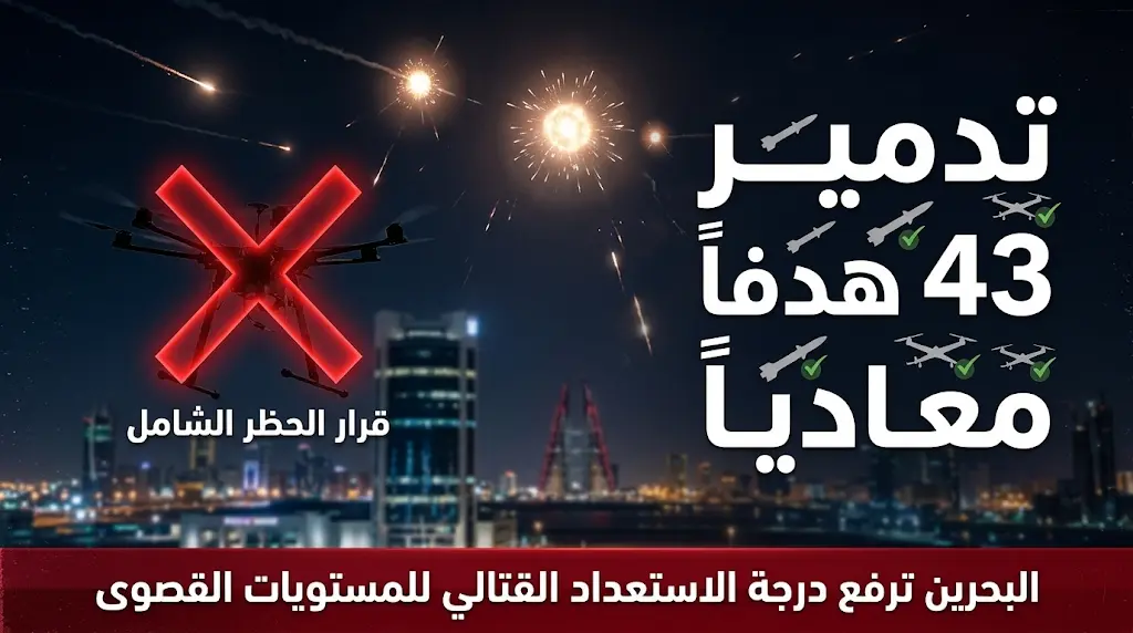 رفعت مملكة البحرين درجة استعدادها الأمني والعسكري إلى المستويات القصوى اليوم الأحد 29 مارس 2026، وذلك في أعقاب سلسلة من التطورات الميدانية والقرارات السيادية الصارمة لحماية الأمن القومي، وشملت الإجراءات حظراً كلياً للطائرات المسيرة، وإحباط هجمات جوية واسعة، وتفكيك خلايا تجسس مرتبطة بجهات خارجية.