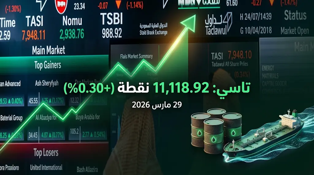 سجل مؤشر سوق الأسهم السعودية الرئيسي (تاسي) انطلاقة إيجابية في أولى جلسات الأسبوع، اليوم الأحد 29 مارس 2026، حيث نجح في تعزيز مكاسبه والبقاء فوق حاجز 11,100 نقطة، يأتي هذا الصعود في وقت تترقب فيه الأسواق العالمية تداعيات المشهد الجيوسياسي الراهن وتأثيراته المباشرة على إمدادات الطاقة، خاصة مع استمرار أسعار النفط في مستويات مرتفعة.