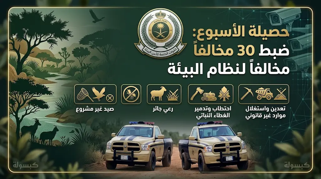 أعلنت القوات الخاصة للأمن البيئي، اليوم الأحد 29 مارس 2026 (الموافق 10 شوال 1447 هـ)، عن حصيلة عملياتها الرقابية الميدانية خلال الأسبوع الماضي، وأسفرت الحملات عن إلقاء القبض على 30 شخصاً من المواطنين والمقيمين لارتكابهم مخالفات صريحة لنظام البيئة في عدة مناطق ومحميات ملكية، وذلك ضمن الجهود المستمرة لتعزيز الاستدامة البيئية وحماية الحياة الفطرية في المملكة.
