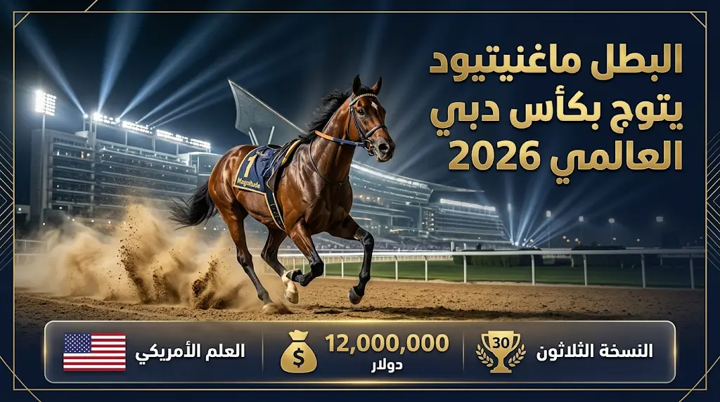 شهد مضمار “ميدان” العالمي في دبي ليلة استثنائية ستبقى محفورة في ذاكرة سباقات الخيل، حيث نجح الجواد الأمريكي «ماغنيتيود» في تفجير مفاجأة من العيار الثقيل بانتزاعه لقب النسخة الثلاثين من “كأس دبي العالمي” 2026 للفئة الأولى، وبالرغم من قوة المنافسة الدولية، استطاع البطل حسم السباق الأغلى في العالم، متفوقاً على نخبة من أفضل الجياد التي توافدت من مختلف القارات.