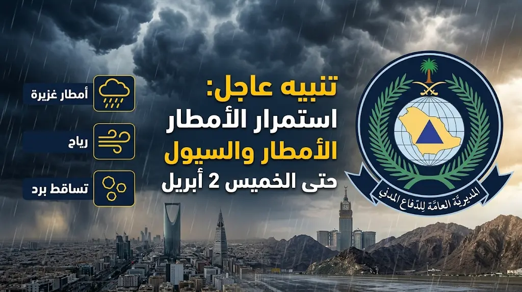 أصدرت المديرية العامة للدفاع المدني، اليوم الاثنين 30 مارس 2026 (الموافق 11 شوال 1447 هـ)، تنبيهاً عاجلاً للمواطنين والمقيمين في مختلف مناطق المملكة، بضرورة توخي أعلى درجات الحيطة والحذر نتيجة استمرار الحالة المناخية المطرية والتقلبات الجوية التي تشهدها البلاد حالياً.
