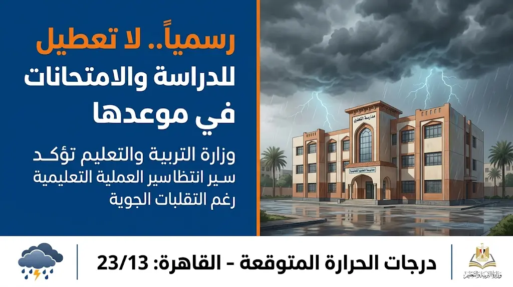 - لا تعطيل للدراسة: لم يصدر أي قرار رسمي بمنح إجازة يومي الأربعاء والخميس حتى هذه اللحظة، والقرار يعود للمحافظين بالتنسيق مع غرفة العمليات حسب حالة كل محافظة.