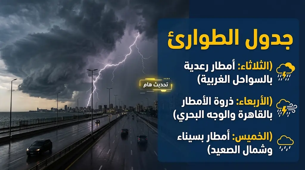 | 1 أبريل 2026 | الأربعاء | ذروة الأمطار ونشاط رياح | القاهرة الكبرى، الوجه البحري، مدن القناة |
