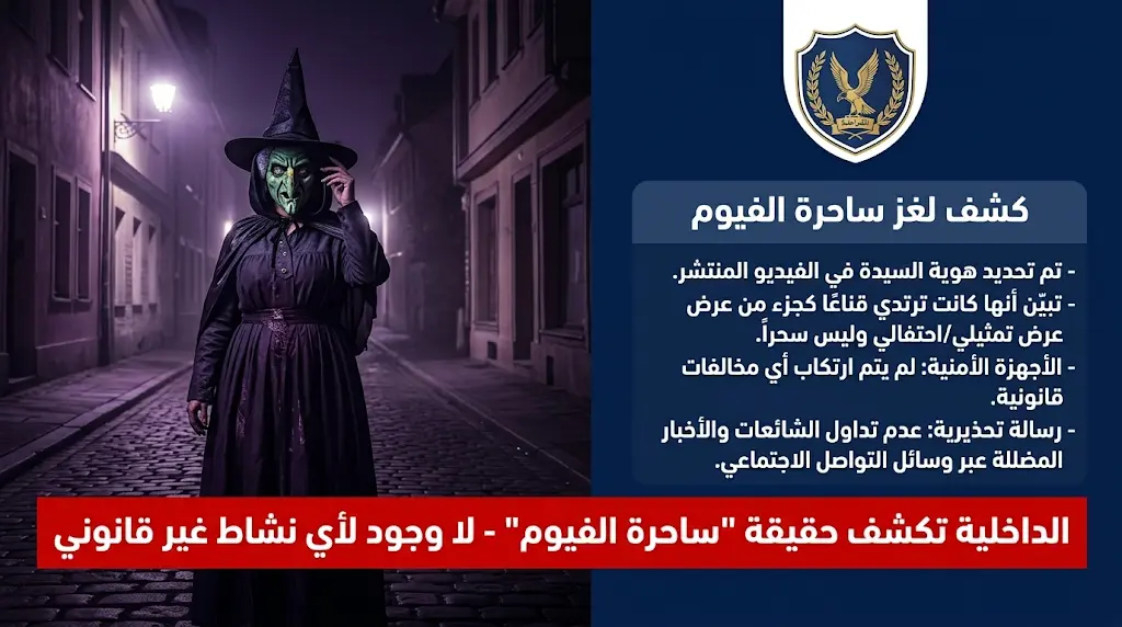 أنهت الأجهزة الأمنية بوزارة الداخلية المصرية، اليوم الاثنين 30 مارس 2026، حالة الجدل والقلق التي سادت الشارع المصري ومواقع التواصل الاجتماعي خلال الساعات الماضية، عقب تداول صور وفيديوهات لفتاة تتجول بزي “ساحرة شريرة” في شوارع محافظة الفيوم، وأصدرت الوزارة بياناً رسمياً يوضح التفاصيل الكاملة للواقعة وهوية الفتاة والدوافع وراء هذا التصرف.