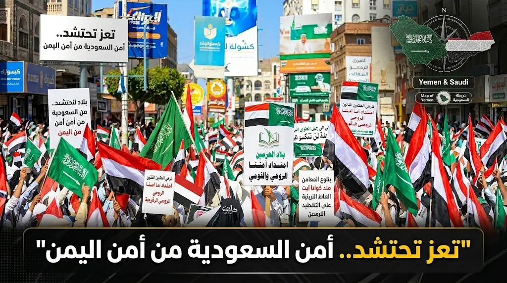 احتشد آلاف المواطنين في شارع جمال بقلب مدينة تعز، رافعين أعلام المملكة العربية السعودية والجمهورية اليمنية، وصوراً تعبر عن وحدة المصير المشترك، وجاءت هذه المظاهرة رداً على التصعيد الأخير والاعتداءات التي طالت منشآت مدنية وحيوية في المنطقة، والتي اعتبرها المتظاهرون استهدافاً مباشراً لاستقرار الشعوب العربية كافة.