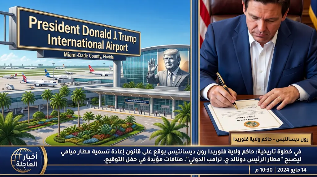 اعتمد حاكم ولاية فلوريدا، رون ديسانتيس، القانون رسمياً اليوم، مؤكداً أن هذه الخطوة تأتي في سياق تكريم الرئيس الأمريكي وتخليد اسمه على واحدة من أهم المنشآت الحيوية في الولاية، ويعد المطار البوابة الرئيسية لمنطقة بالم بيتش، التي شهدت نمواً اقتصادياً كبيراً خلال السنوات الأخيرة.