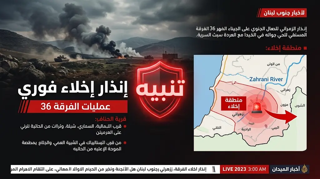 إنذار إخلاء عاجل لسكان جنوب نهر الزهراني وعمليات عسكرية مكثفة للفرقة 36 في لبنان