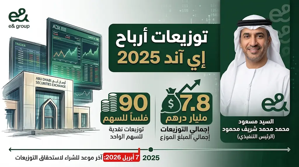 توزيعات أرباح إي آند لعام 2025 تصل لـ 90 فلساً للسهم وتحديد آخر موعد للشراء للاستحقاق
