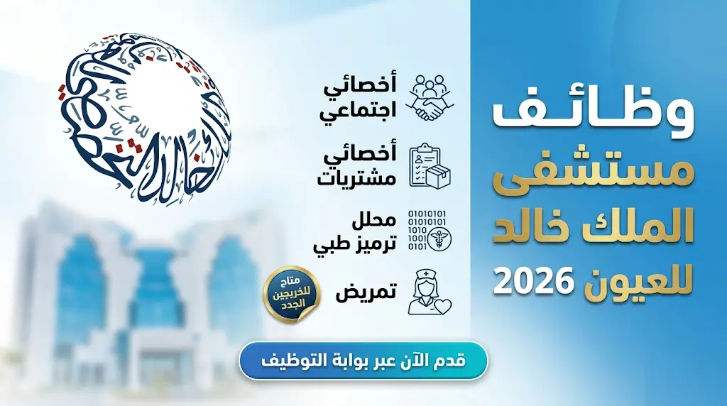أعلن مستشفى الملك خالد التخصصي للعيون بالرياض، اليوم الثلاثاء 31 مارس 2026م، عن فتح باب التقديم لشغل مجموعة من الوظائف الإدارية والطبية الشاغرة، وتستهدف هذه الفرص الكوادر الوطنية من حملة شهادات الدبلوم والبكالوريوس في عدة تخصصات، للعمل ضمن منظومة المستشفى الرائدة في تقديم الرعاية الطبية المتخصصة.
