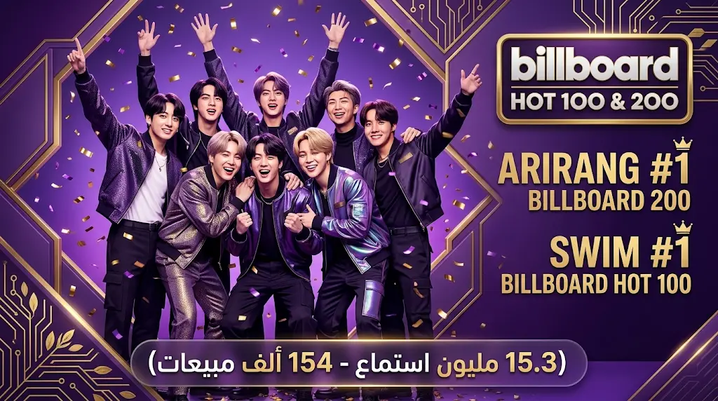 في خطوة تثبت ريادتها المطلقة لساحة الموسيقى العالمية في عام 2026، نجحت فرقة BTS الكورية في انتزاع صدارة المشهد الغنائي الدولي، حيث استقر ألبومها الخامس “Arirang” في المركز الأول لقائمة Billboard 200، بالتزامن مع قفزة الأغنية الرئيسية “Swim” إلى قمة قائمة Billboard Hot 100، متفوقة بذلك على نخبة من الفنانين العالميين.
