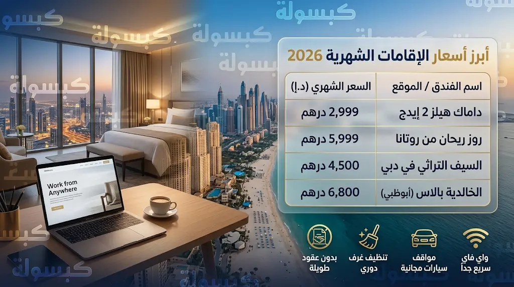| الفندق / المنشأة | السعر الشهري (ابتداءً من) | الميزة التنافسية لعام 2026 |