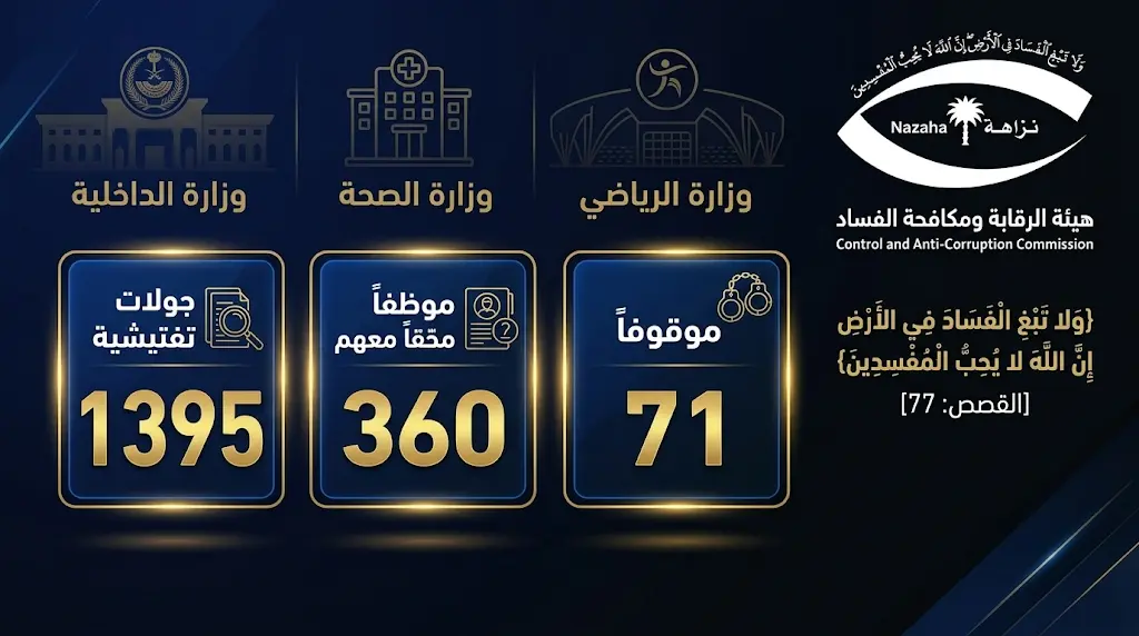 أعلنت هيئة الرقابة ومكافحة الفساد (نزاهة)، اليوم الأربعاء 1 أبريل 2026 (الموافق 14 شوال 1447 هـ)، عن تفاصيل نتائج جهودها الميدانية والجنائية التي باشرتها خلال شهر مارس الماضي، وتأتي هذه التحركات في إطار الاستراتيجية الوطنية لحماية النزاهة ومكافحة الفساد، لضمان أعلى مستويات الشفافية في الأداء الحكومي.