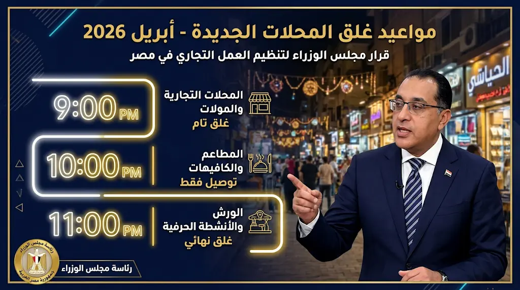 أصدرت الحكومة المصرية قراراً رسمياً اليوم، الأربعاء 1 أبريل 2026، يقضي بتعديل مؤقت لمواعيد غلق المحال التجارية والمطاعم والمراكز العامة على مستوى الجمهورية، يأتي هذا القرار تزامناً مع استعدادات الدولة لاستقبال أعياد المسيحيين لعام 2026، وبهدف الموازنة بين تلبية احتياجات المواطنين الشرائية خلال فترة الأعياد وبين خطة الدولة الاستراتيجية لترشيد استهلاك الطاقة الكهربائية.