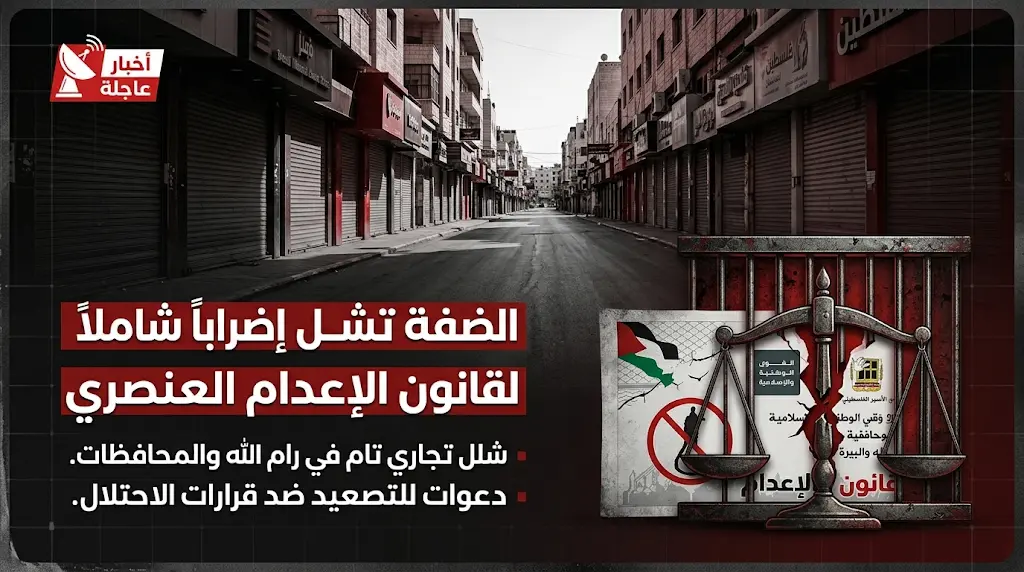 شهدت كبرى محافظات الضفة الغربية المحتلة، اليوم الأربعاء 1 أبريل 2026، استجابة واسعة لدعوات الإضراب العام، تنديداً بالتشريع الجديد الذي أقره الكنيست الإسرائيلي والقاضي بتطبيق عقوبة الإعدام بحق الأسرى، وشمل الإغلاق كافة الأنشطة الاقتصادية والمرافق العامة، تعبيراً عن الرفض الشعبي والسياسي القاطع لهذا القانون الذي يستهدف الفلسطينيين بشكل مباشر ويخالف المواثيق الدولية.