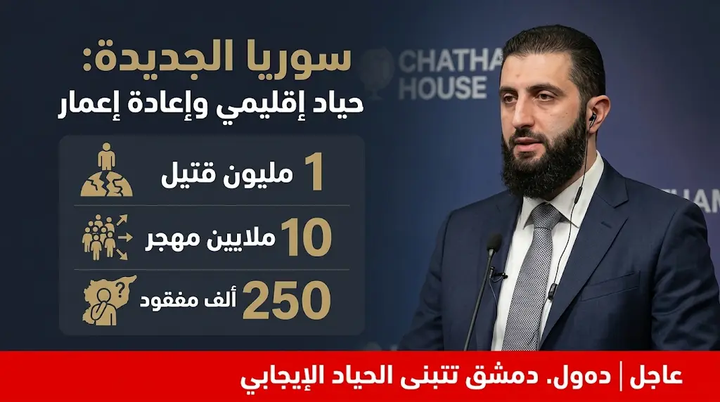 خلال مشاركته في جلسة حوارية بالمعهد الملكي للشؤون الدولية “تشاتام هاوس” بالعاصمة البريطانية لندن، أوضح الشرع أن التدخلات الإيرانية ودعمها للميليشيات كان سبباً مباشراً في المأساة السورية، مستعرضاً حصيلة الأزمة التي امتدت لـ 14 عاماً: