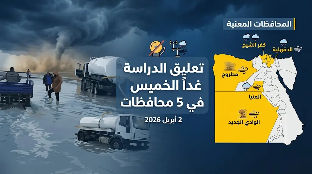 أصدر محافظو خمس محافظات مصرية قرارات رسمية تقضي بتعليق الدراسة في كافة المدارس والمعاهد الأزهرية غداً الخميس، الموافق 2 أبريل 2026، تأتي هذه الخطوة الاستباقية بناءً على تحذيرات الهيئة العامة للأرصاد الجوية بشأن تقلبات جوية حادة تشمل أمطاراً غزيرة وعواصف ترابية تهدد سلامة الطلاب والمواطنين.