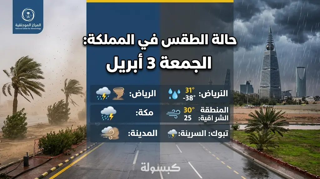 | الرياض، مكة المكرمة، المدينة المنورة | أمطار رعدية (خفيفة إلى متوسطة) | اليوم الجمعة 3-4-2026 |
