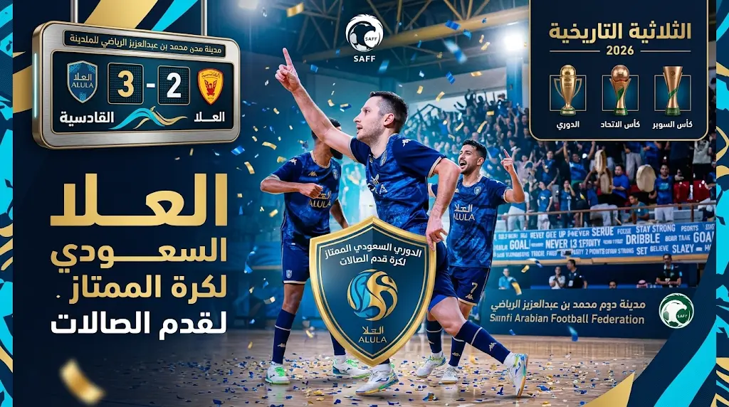 حقق نادي العلا إنجازاً رياضياً غير مسبوق في تاريخ كرة القدم السعودية للصالات، بإعلانه بطلاً للدوري السعودي الممتاز لكرة قدم الصالات للموسم الرياضي 2025-2026، جاء ذلك عقب تغلبه على منافسه نادي القادسية في المباراة الختامية التي أقيمت مساء أمس الخميس 2 أبريل 2026 (الموافق 15 شوال 1447 هـ)، وسط حضور جماهيري غفير في المدينة المنورة.