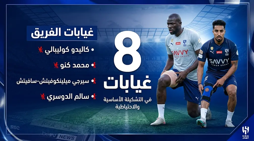 وفقاً للبيانات الرسمية الصادرة عن نادي الهلال، تنوعت أسباب الغياب بين الإصابات العضلية والإيقافات، وكانت الصدمة الأكبر للجهاز الفني هي تعرض المدافع كاليدو كوليبالي ولاعب الوسط محمد كنو لإصابات مفاجئة خلال المران الجماعي الأخير، قبل 48 ساعة فقط من انطلاق المباراة.