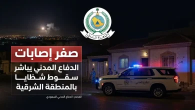 الدفاع المدني يباشر حادثة سقوط شظايا اعتراض صاروخ باليستي في المنطقة الشرقية دون وقوع إصابات بشرية
