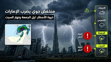 أعلن المركز الوطني للأرصاد في دولة الإمارات العربية المتحدة عن استمرار حالة عدم الاستقرار الجوي التي تضرب البلاد اليوم الأربعاء…