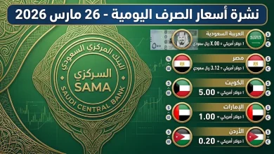 أعلن البنك المركزي السعودي (ساما) عن تحديثات أسعار صرف العملات الأجنبية ليوم الخميس 26 مارس 2026 الموافق 7 شوال 1447…