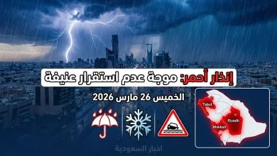 تفاصيل حالة الطقس اليوم الخميس 26 مارس 2026 في السعودية وقرار تحويل الدراسة عن بعد في مناطق الإنذار الأحمر